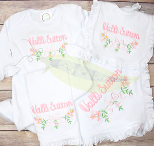 Please indicate in the personalization section the initials or name to be monogrammed below the design. Traditionally, monogram is First Name, Last Name, Middle Name. For example: Mary Elizabeth Smith - mSe. To avoid any confusion, please list full name, as well. We stitch exactly how it is typed.