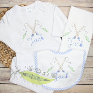 Please indicate in the personalization section the initials or name to be monogrammed below the design. Traditionally, monogram is First Name, Last Name, Middle Name. For example: Mary Elizabeth Smith - mSe. To avoid any confusion, please list full name, as well. We stitch exactly how it is typed.