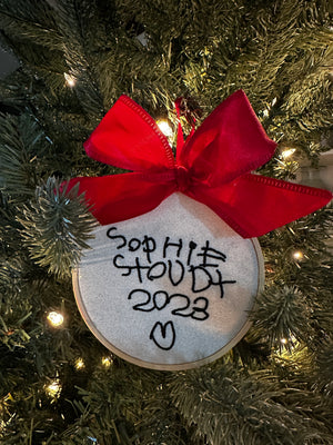 Ornament is a 4” hoop on white fabric with a bow. Please upload a clear, bright photo of child’s handwriting. Black marker is preferred, but not necessary.