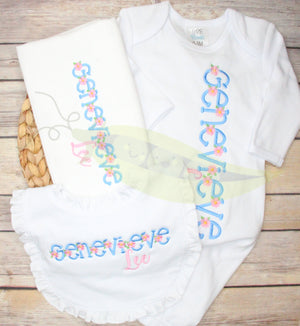 Please indicate in the personalization section the initials or name to be monogrammed below the design. Traditionally, monogram is First Name, Last Name, Middle Name. For example: Mary Elizabeth Smith - mSe. To avoid any confusion, please list full name, as well. We stitch exactly how it is typed.
